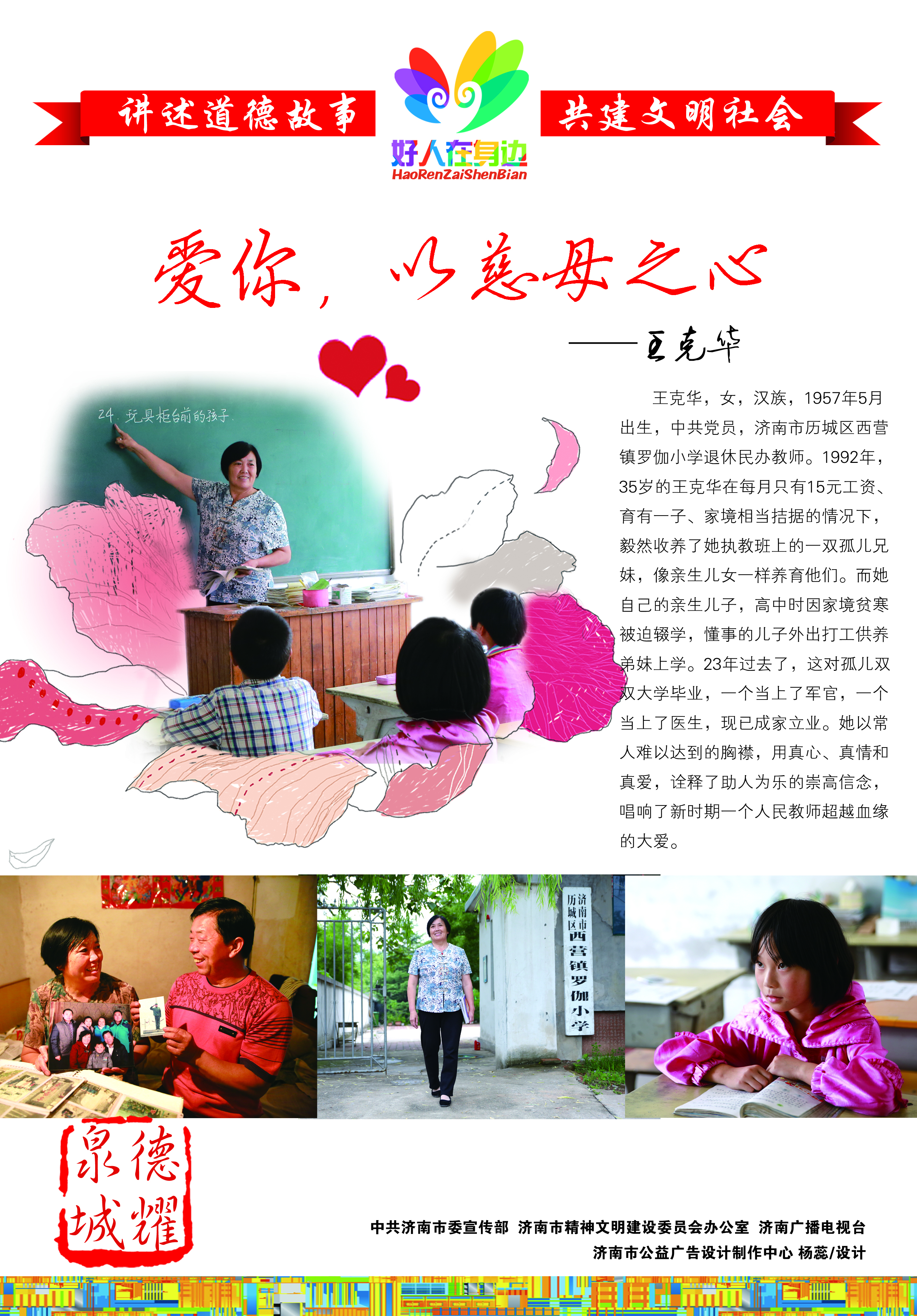 王克华,女,汉族,1957年5月出生,中共党员,1975年5月参加工作,济南市历城区西营镇罗伽小学退休民办教师。 1992年,民办教师王克华35岁,育有一儿子,她每月只有15元的工资,家境相当拮据。就在这时,她做出一个惊人之举,把一双孤儿兄妹领回了家里,像自己亲生儿女一样照料抚养,倾心教导。一晃23年过去了,这对孤儿双双大学毕业,一个当上了军官,一个当……[更多] |